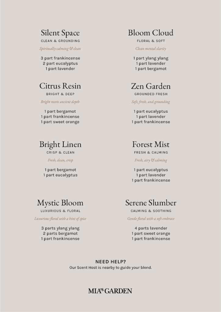 We bring a fully styled tablescape with six mist-ready oil taps, personalized labels, and a scent host to guide every guest. Each mist is designed to refresh linens, workspaces, or personal surroundings — and is packaged to match your event.